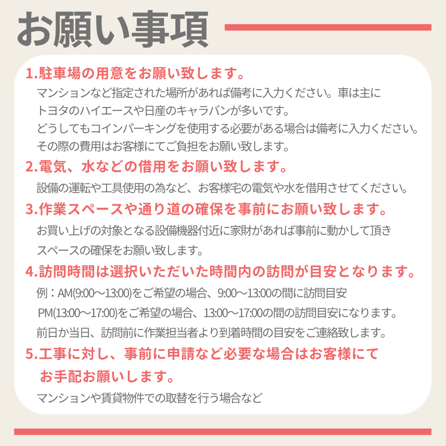 お買い上げとなる設備機器付近に家財があれば事前に動かして頂きスペースの確保をお願い致します。